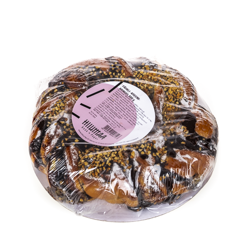 NISUJAHU, vaniljekreem 30% (suhkur, modifitseeritud tärklis (E1414), dekstroos,VADAKUPULBER, palmiõli, stabilisaator (E170), paksendaja (E401), lõhna- ja maitseained, sool, toiduvärvid (E101; E160a)), margariin (taimsed rafineeritud hüdrogeenimata õlid (palm, raps), vesi, emulgaatorid (E471), sool, happesuse regulaator (E330); säilitusaine (E202), lõhna- ja maitseained, toiduvärv (E160c)), vesi, maapähkel 10%, suhkur, rosinad, kakaoglasuur (suhkur, taimerasv (palm, shea tuum), vähendatud rasvasisaldusega kakaopulber, emulgaator (letsitiin päevalill), lõhna ja maitseained ), KANAMUNA, pärm, kaneel, sool, jahuparandaja (NINUJAHU, emulgaator (E481), antioksüdant (E330),